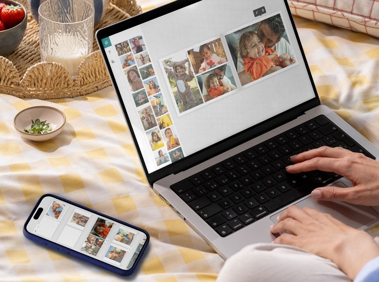 Lav fotobøger i appen den ene dag og på nettet den anden – dine primære projekter synkroniseres automatisk! (Ekskl. vores desktop-appprogram)